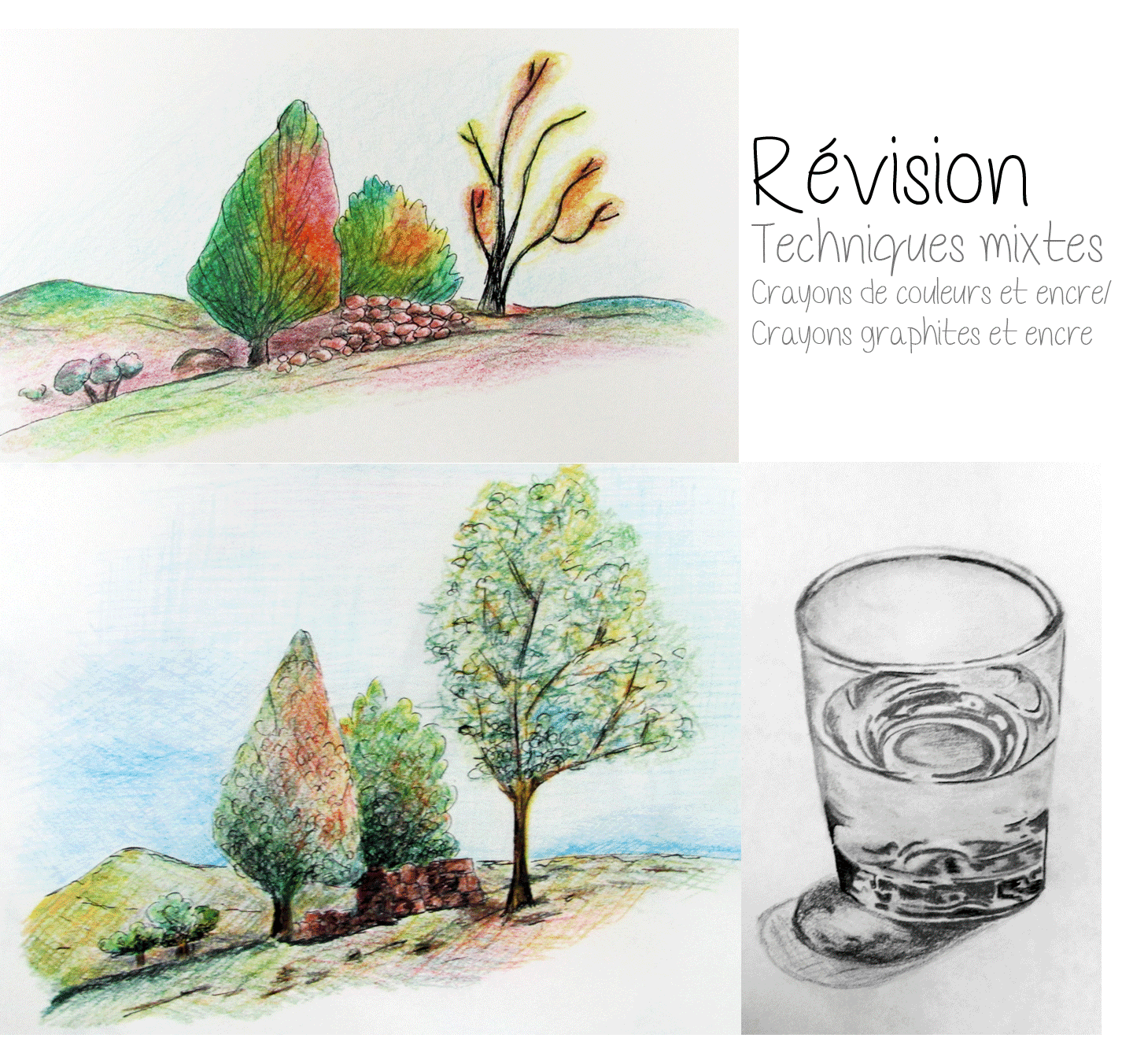 Pour l'avant dernier cours, j'offre toujours la possibilité aux étudiants d'apprendre des techniques, sujets ou explorations que nous n'avons pas eu la chance de voir. Geneviève voulait explorer plus en détails les crayons de couleurs et Andréa voulait avoir des trucs pour dessiner le verre. Ce sont de superbes illustrations qu'elles ont réalisées suite à mes conseils :). Pour ce qui est des paysages aux crayons de couleurs avec encre, les deux dessins sont très différents et beaux à la fois. J'aime ça!